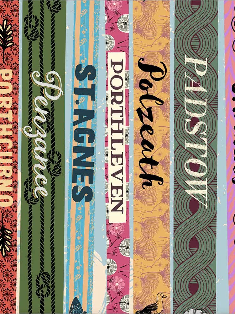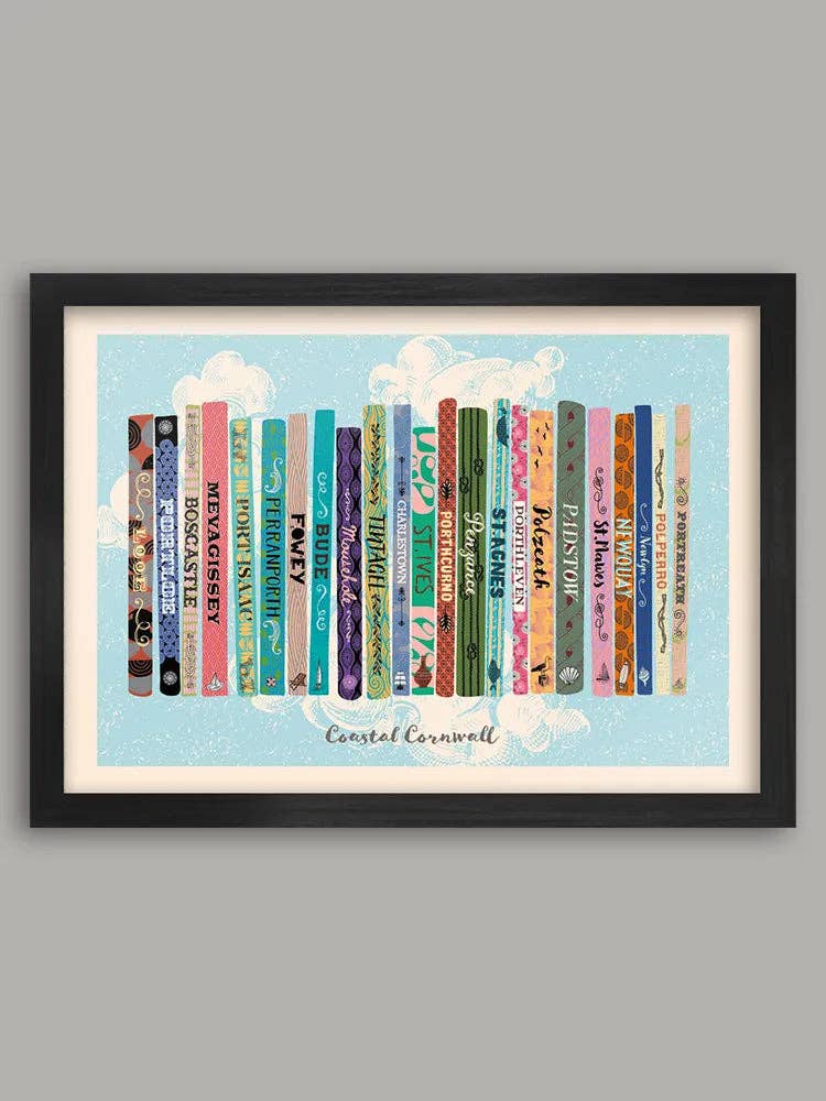 Celebrating some of Cornwall's famous beaches and coastal towns. The design features a bookshelf style with each place being the title of a book. The pretty patterns and soft colours make this a beautiful piece for your wall.