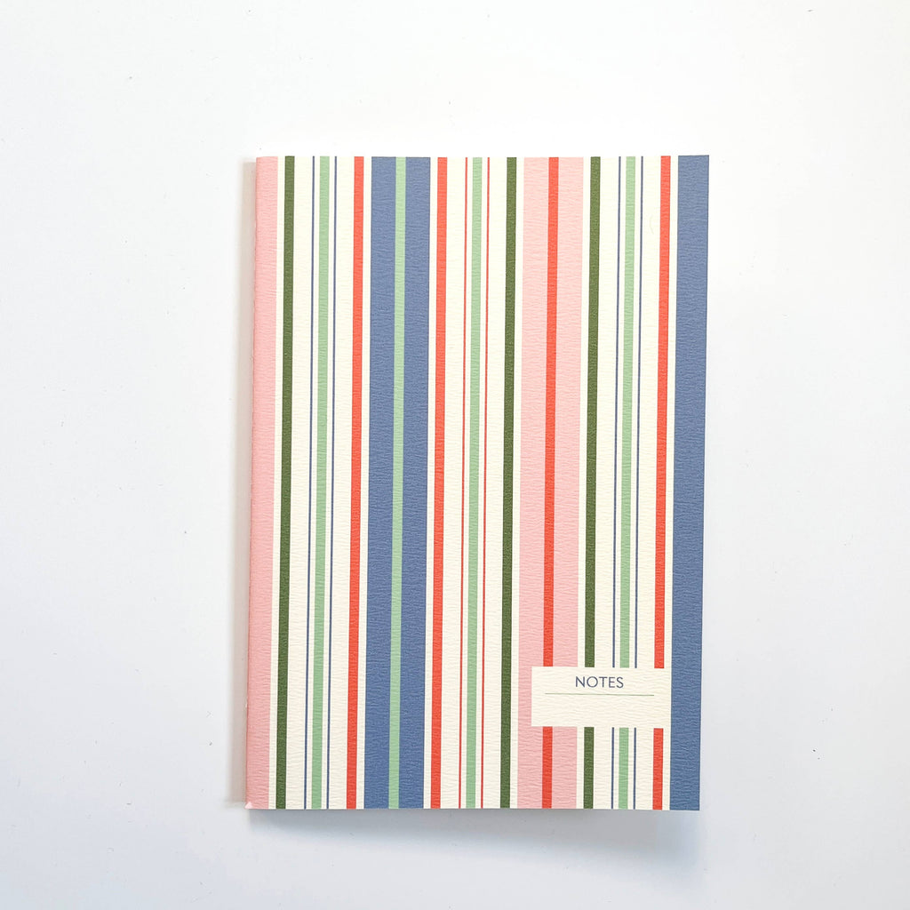 Ivy! This notebook has a soft and breezy feel, with pastel blue, pink, and green stripes. It’s perfect for quick notes, journaling, or sketching, and it's a great pick for anyone who loves light and cheerful stationery. Plain paper.